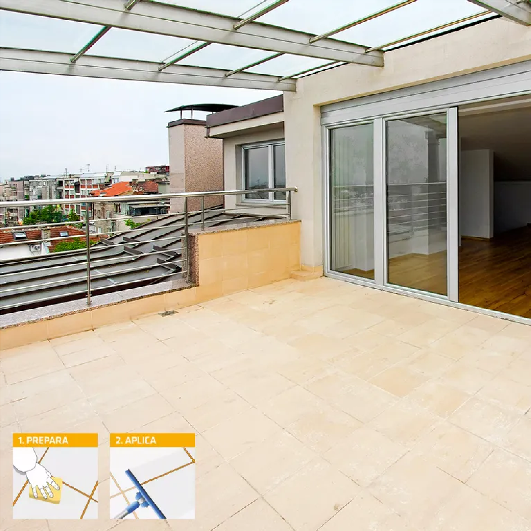 Impermeabilización de las juntas, grietas pequeñas/fisuras de pisos no absorbentes de balcones, terrazas, baños y explanadas.